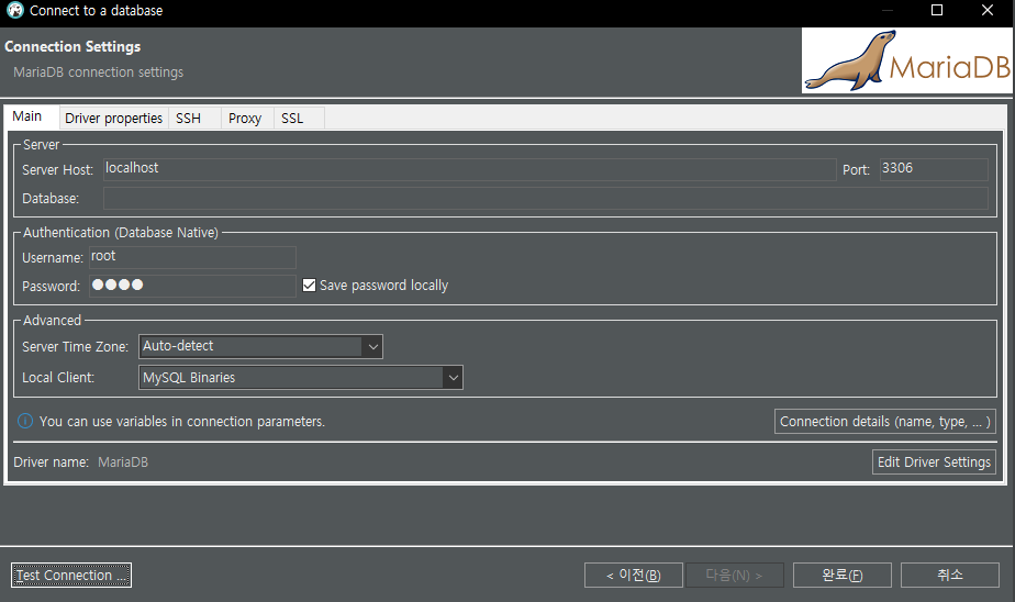 3. root 패스워드 입력 후 'Test Connection' 버튼 클릭