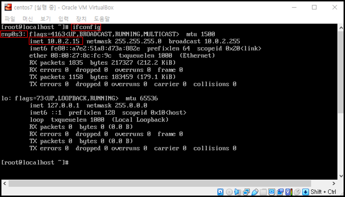 - CentOS7 기준 VirtualBox VM에 네트워크 어댑터를 추가할 경우 enp0s3의 인터페이스가 추가되며 IP도 기본적으로 10.0.2.15가 설정됨