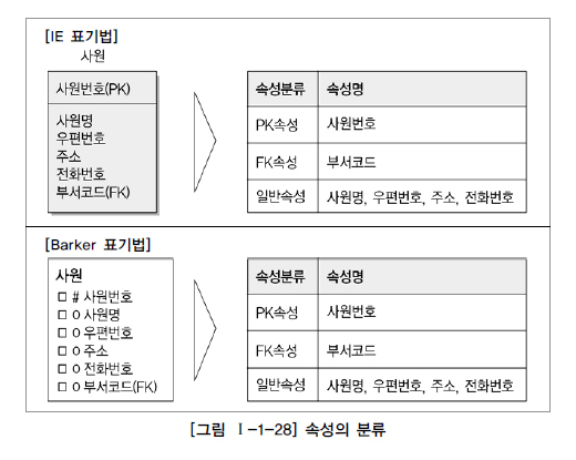 엔터티 구성방식에 따른 분류는 엔터티를 식별할 수 있는 속성을 PK(Primary Key)속성, 다른 엔터티와의 관계에서 포함된 속성을 FK(Foreign Key)속성, 엔터티에 포함되어 있고 PK/FK에 포함되지 않은 속성을 일반속성이라 한다.