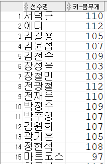 [예제] 선수들의 키와 몸무게를 이용해서 BMI(Body Mass Index) 비만지수를 측정한다.