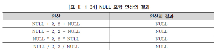 - NULL 값을 포함하는 연산의 경우 결과 값도 NULL 값이다. 모르는 데이터에 숫자를 더하거나 빼도 결과는 마찬가지로 모르는 데이터인 것과 같다.