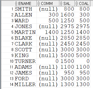 [예제] 사원 테이블에서 커미션을 1차 선택값으로, 급여를 2차 선택값으로 선택하되 두 칼럼 모두 NULL인 경우는 NULL로 표시한다.