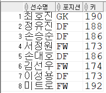 [예제] '장'씨 성을 가진 선수들의 정보를 조회하는 WHERE 절을 작성한다.