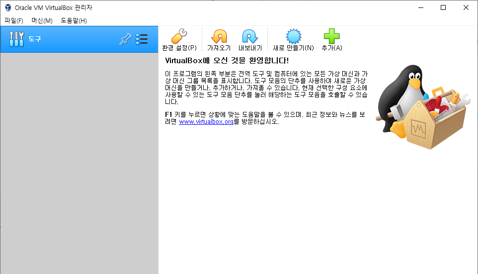 3. Oracle VM VirtualBox 관리자 창이 나타나면 설치 완료.