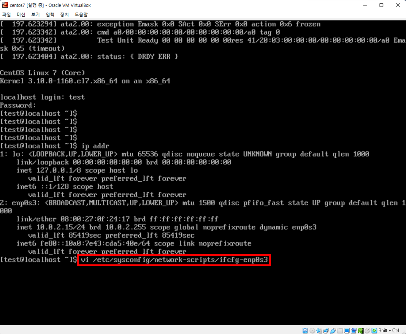 2. vi /etc/sysconfig/network-scripts/ifcfg-enp0s3 입력