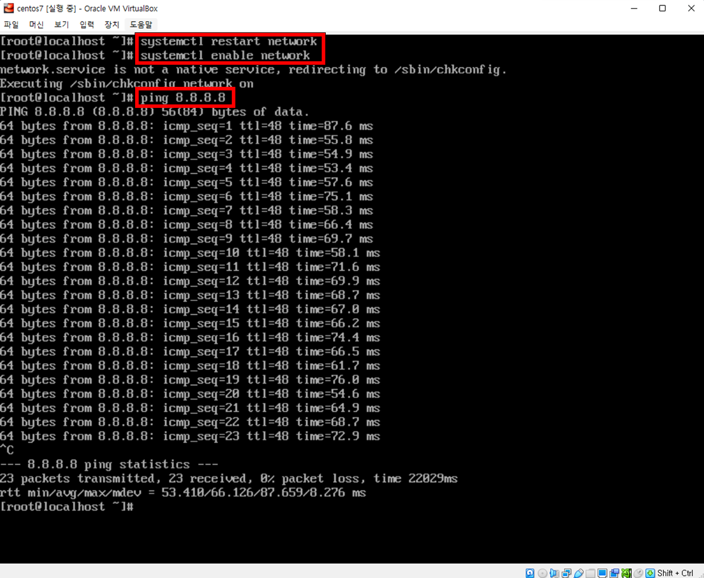 (3) ping 8.8.8.8(외부에 ping을 날림으로써 외부로의 네트워크가 연결이 되었는지 확인)