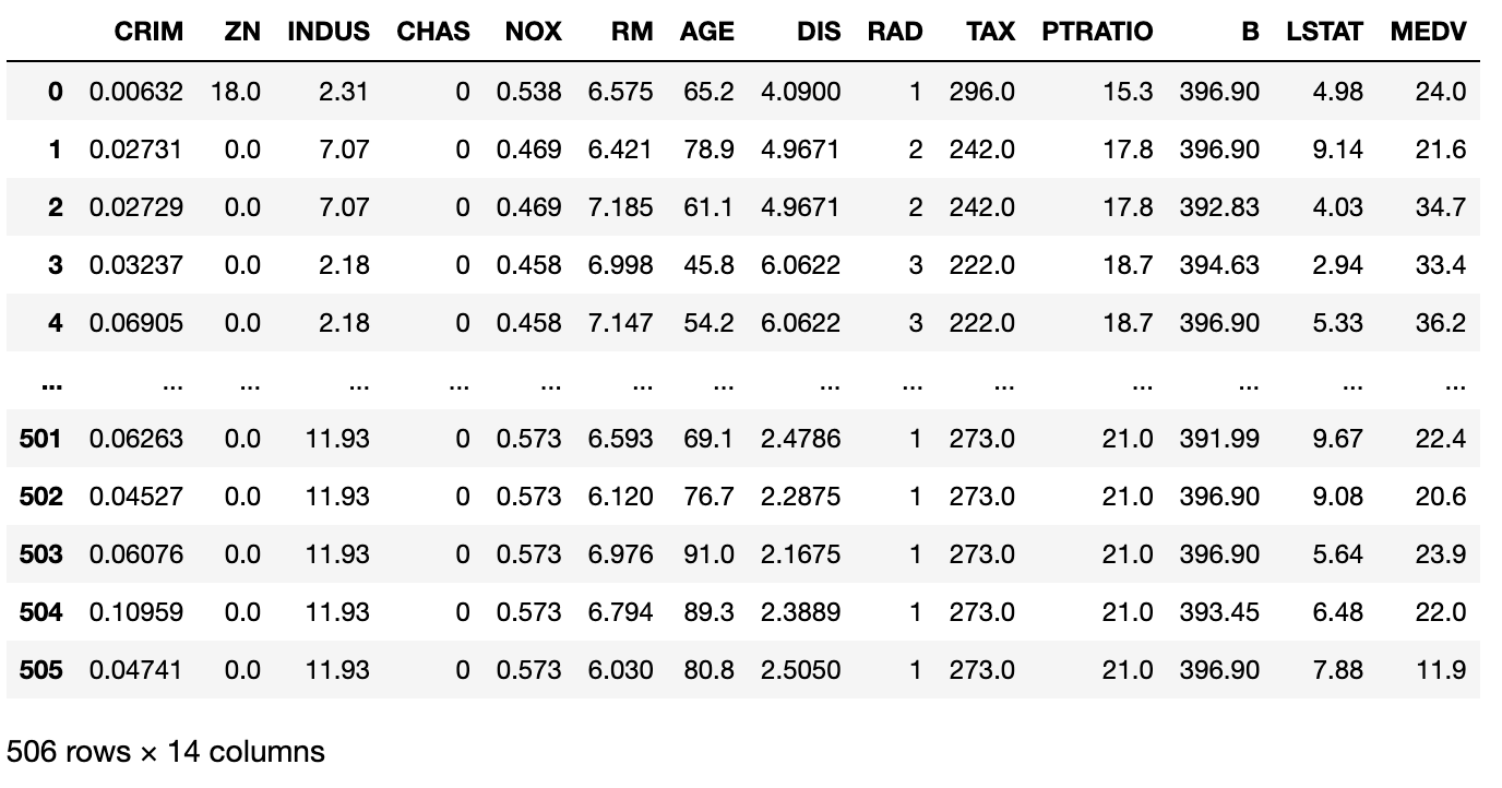 column_names = ['CRIM', 'ZN', 'INDUS', 'CHAS', 'NOX', 'RM', 'AGE', 'DIS', 'RAD', 'TAX', 'PTRATIO', 'B', 'LSTAT', 'MEDV']