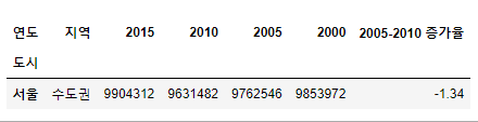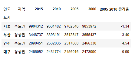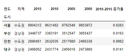 >>> Index(['지역', '2015', '2010', '2005', '2000', '2010-2015 증가율'], dtype='object')