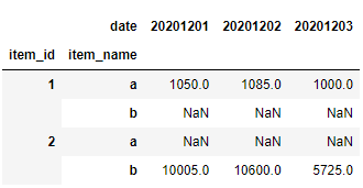 근데 만약 각각의 날짜를 컬럼으로 하여 각 아이템들의 날짜별 평균 가격을 알고 싶으면 어떻게 해야 할까? 다음처럼 pivot_table method를 이용하면 날짜가 컬럼이 되며 가로 데이터로 바뀌었다.